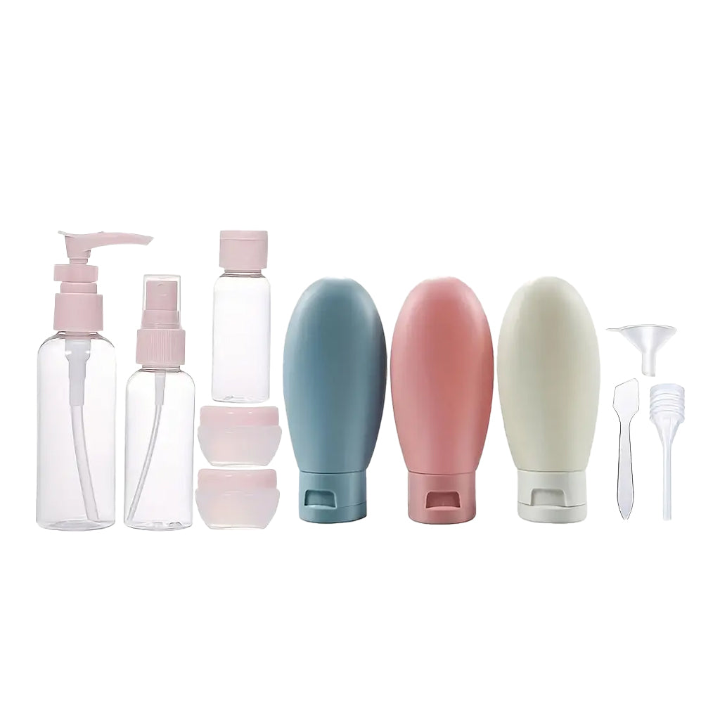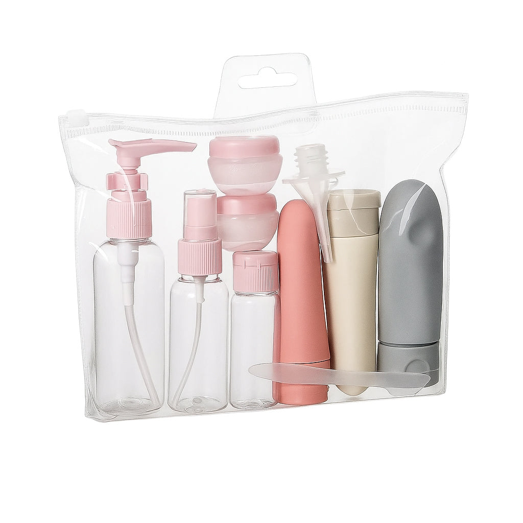 Organiza tus productos de cuidado personal con este set de botellas de viaje reutilizables de 11 piezas, ideal para llevar champú, crema, jabón líquido, gel de ducha o lociones de manera práctica y ordenada. Incluye envases de distintos tamaños con tapas a prueba de fugas, frascos con bomba y spray, embudos y espátulas para facilitar el llenado. Su diseño compacto y ligero cumple con las normas de equipaje de mano, perfecto para viajes, gimnasio o escapadas de fin de semana.