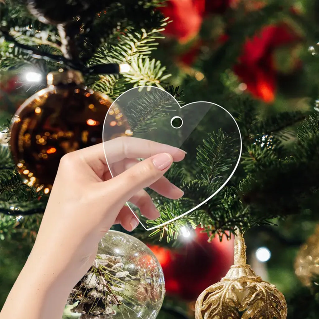 Añade un toque creativo y moderno a tu árbol de Navidad con este set de 10 adornos de acrílico transparente en forma de corazón con cinta dorada para colgar, perfectos para decorar o personalizar. Fabricados en acrílico transparente de 2 mm de grosor, ofrecen una superficie lisa ideal para grabar, pintar o tallar. Estos adornos son ligeros, duraderos y reutilizables, ideales para colgar en el árbol, guirnaldas, coronas o incluso como etiquetas decorativas en regalos. Su transparencia combina fácilmente con cualquier paleta de colores, aportando un estilo elegante y minimalista a tu decoración navideña.